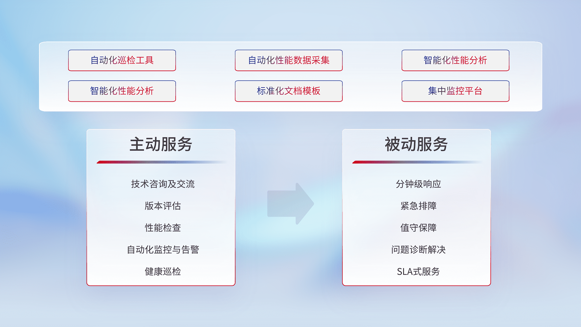 智能化工具和标准化文档,,保障服务质量,,,,提供主动服务(包含技术咨询、、、版本评估、、、性能检查、、自动化监控与告警、、、健康巡检)和被动服务包含(分钟级响应、、紧急排障、、、、值守保障、、问题诊断解决、、、SLA服务)。。。